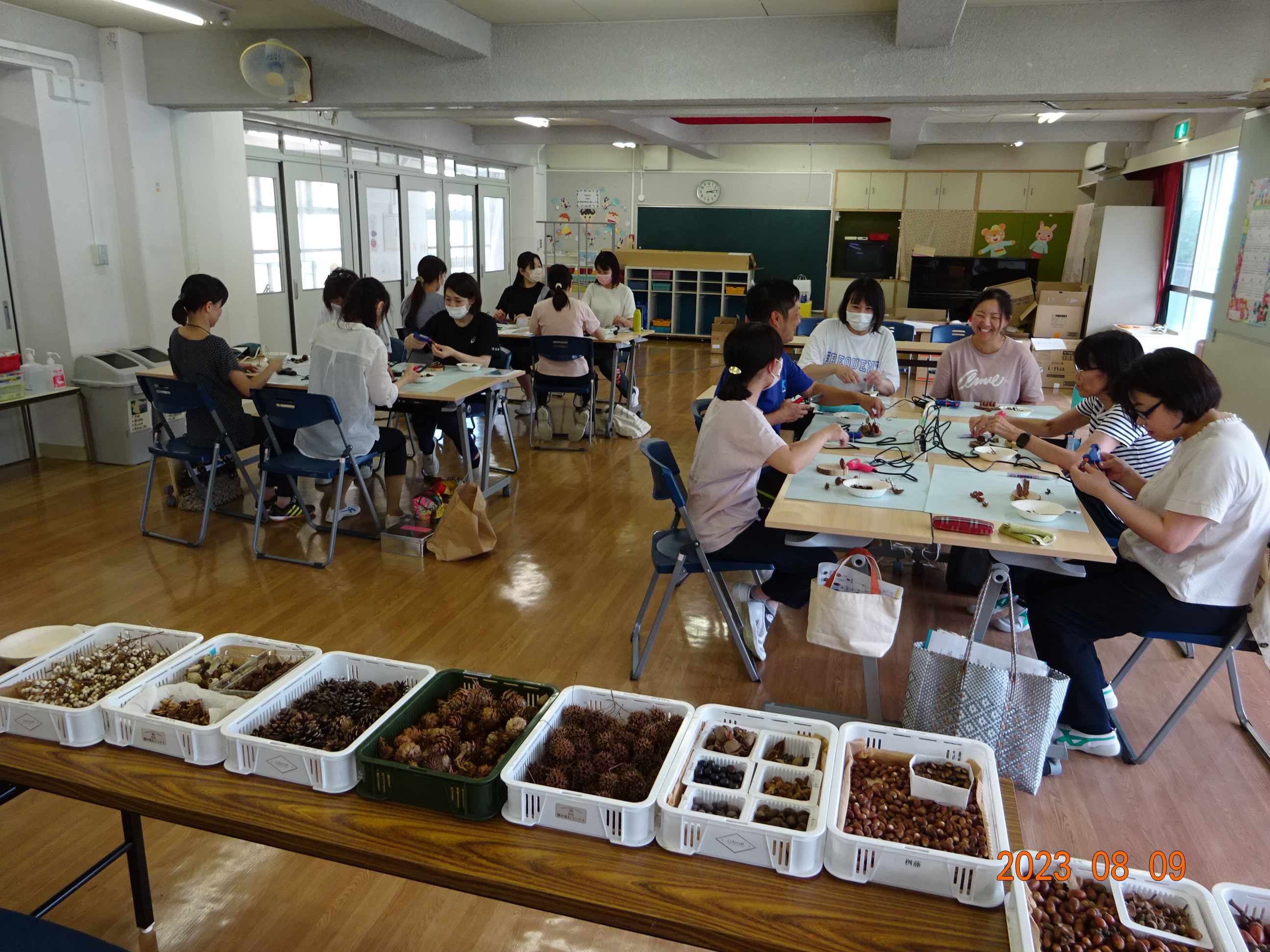 八万南幼稚園で出前環境教室「木の実工作」を8月9日に行いました。